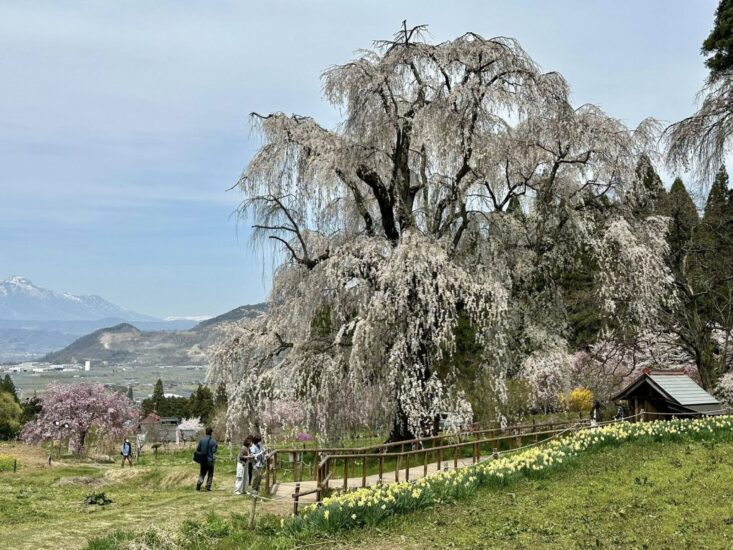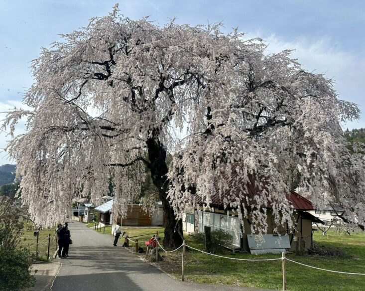 The little northern-Nagano village of Takayama boasts five giant solo cherry blossom trees. You drive up narrow lanes in between farmhouses and rice fields, among apple orchards and quiet residential neighborhoods, and in five separate valleys you come to a massive cherry tree. With a history of up to 600 years, the trees are as large as 22 meters tall.